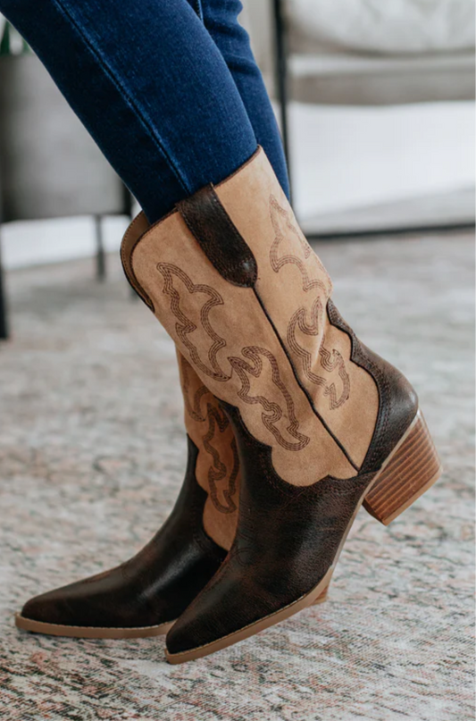 Hooray Brown & Turquoise Embroidered Inlay Boots