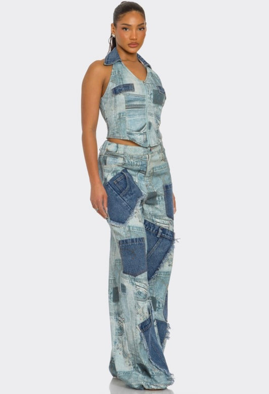 RETRO REVIVAL PATCHWORK DENIM TWO-PIECE SET