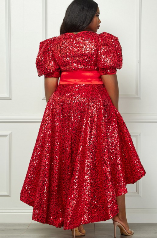 Sequin Puff Half Sleeve Waist Tie Flare HilowDress