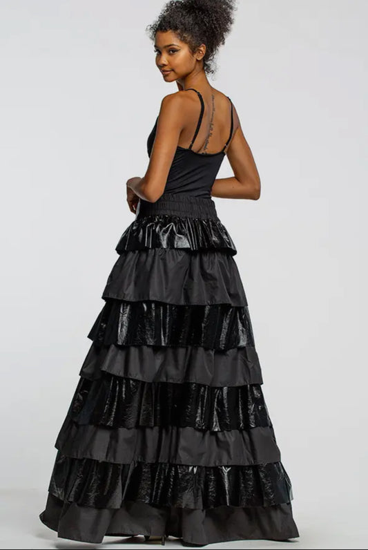 Black Faux Leather Layered Maxi Skirt With Ruffles
