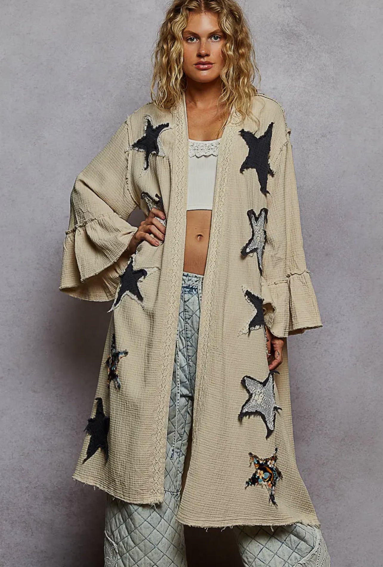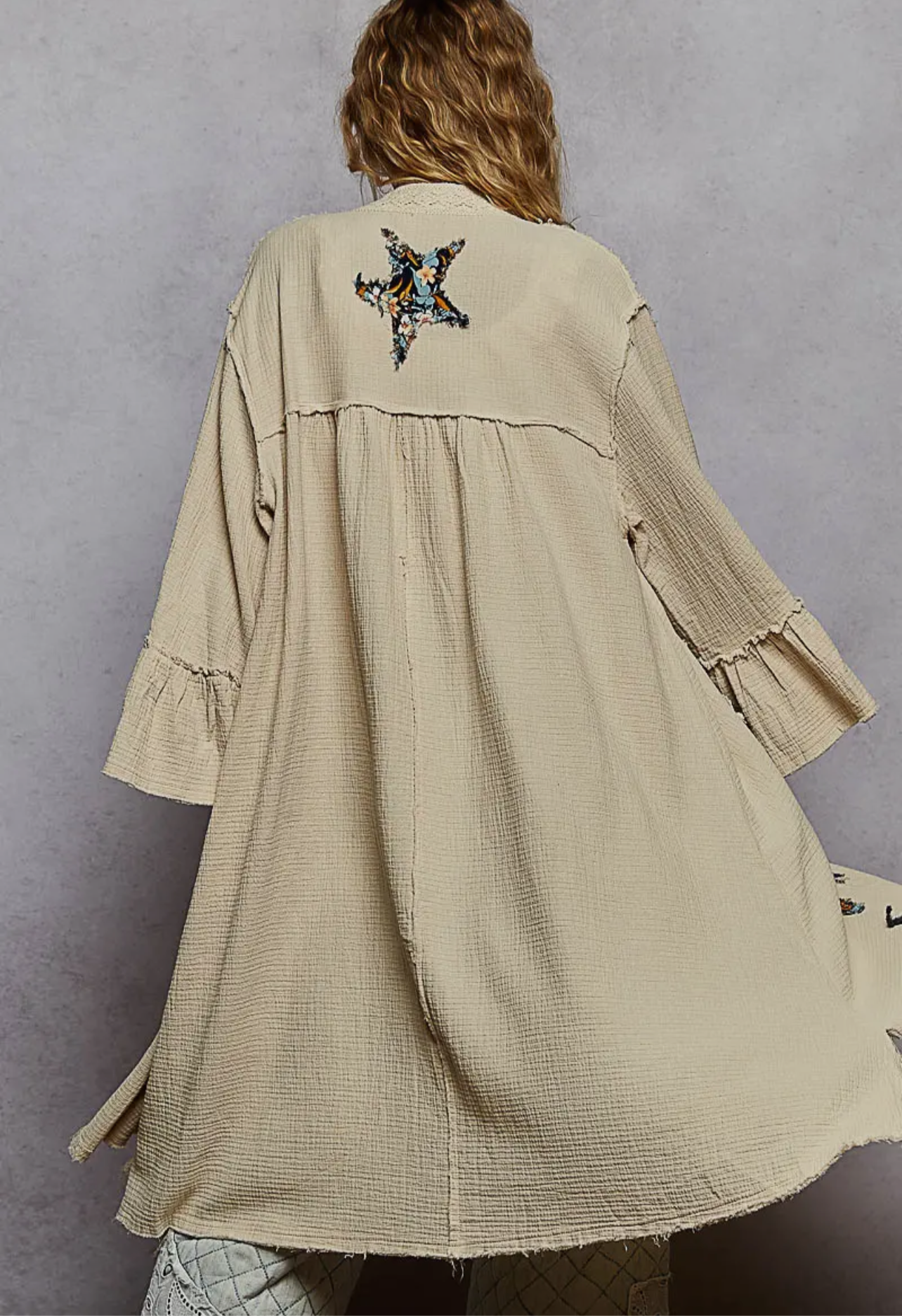 Designed in three quarter sleeve relaxed fit long cardigan in double gauze with outseam, lace and print star patch, sleeve ruffle point, raw edge.