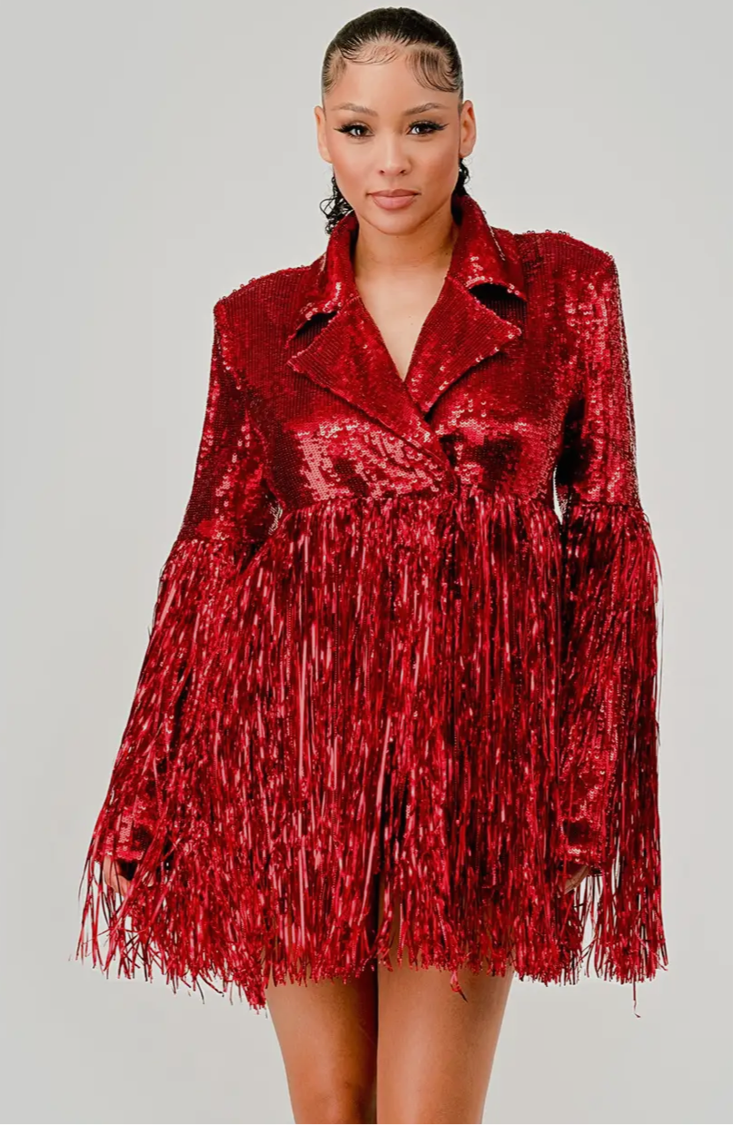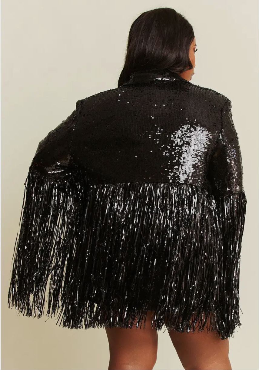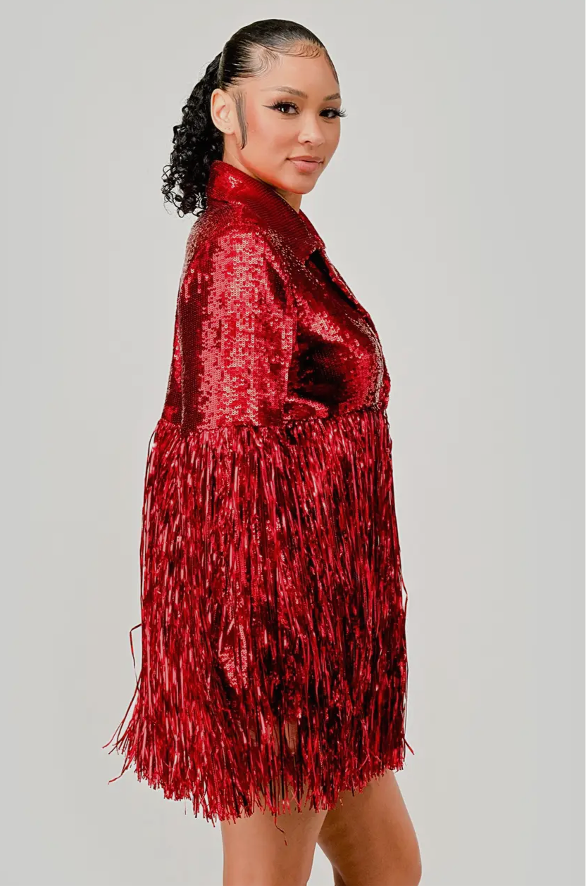 Make an entrance with this sequin party dress-meets-jacket that demands attention. The shimmering sequins and dramatic fringe sleeves radiate bold energy, perfect for turning any night into a celebration. Rock it as a sequin dress with thigh-high boots or wear it open as a sequin jacket over tailored trousers for an elevated vibe.