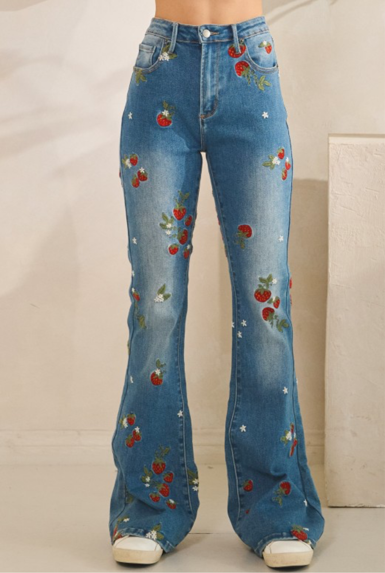 Step into comfort and style with these Denim Washed Strawberry Embroidered Jeans. Featuring a relaxed fit and playful strawberry embroidery, they’re perfect for adding a fun touch to your everyday look. Made from a soft mineral-wash blend of cotton, polyester, and spandex, these pants offer gentle stretch and lasting comfort while staying true to size. Whether you're lounging or out and about, these pants bring effortless charm to your wardrobe.