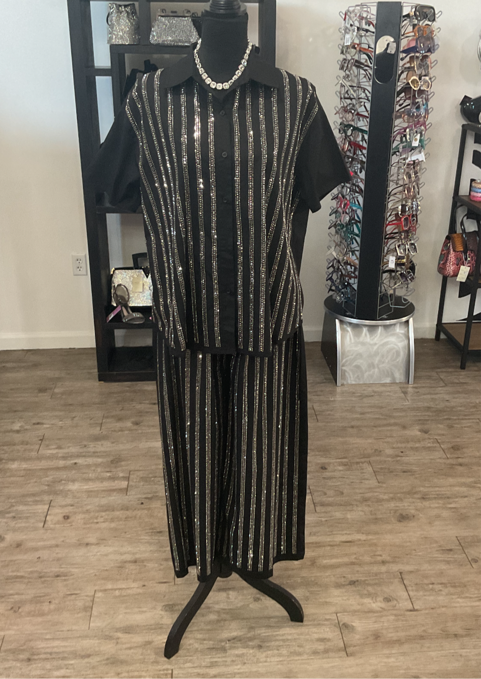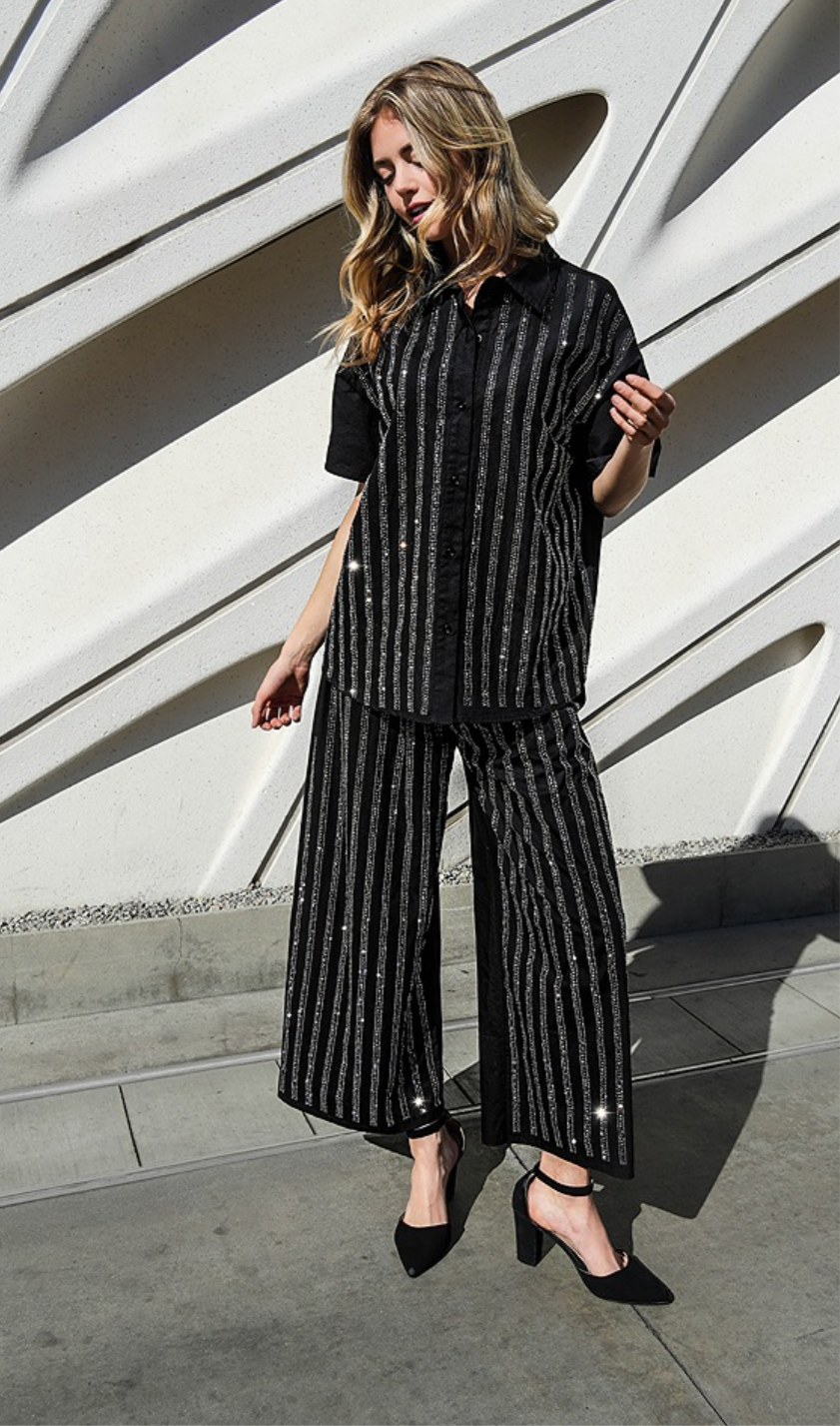 BUTTON-UP SHORT SLEEVE SHIRT DESIGNED WITH EYE-CATCHING VERTICAL RHINESTONE STRIPES THAT ADD SPARKLE AND EDGE. FEATURES A RELAXED FIT WITH A SLIGHTLY CURVED HEM FOR EFFORTLESS STYLING. STRUCTURED COLLAR AND CLEAN FRONT CLOSURE MAKE IT SUITABLE FOR BOTH CASUAL AND DRESSY LOOK .