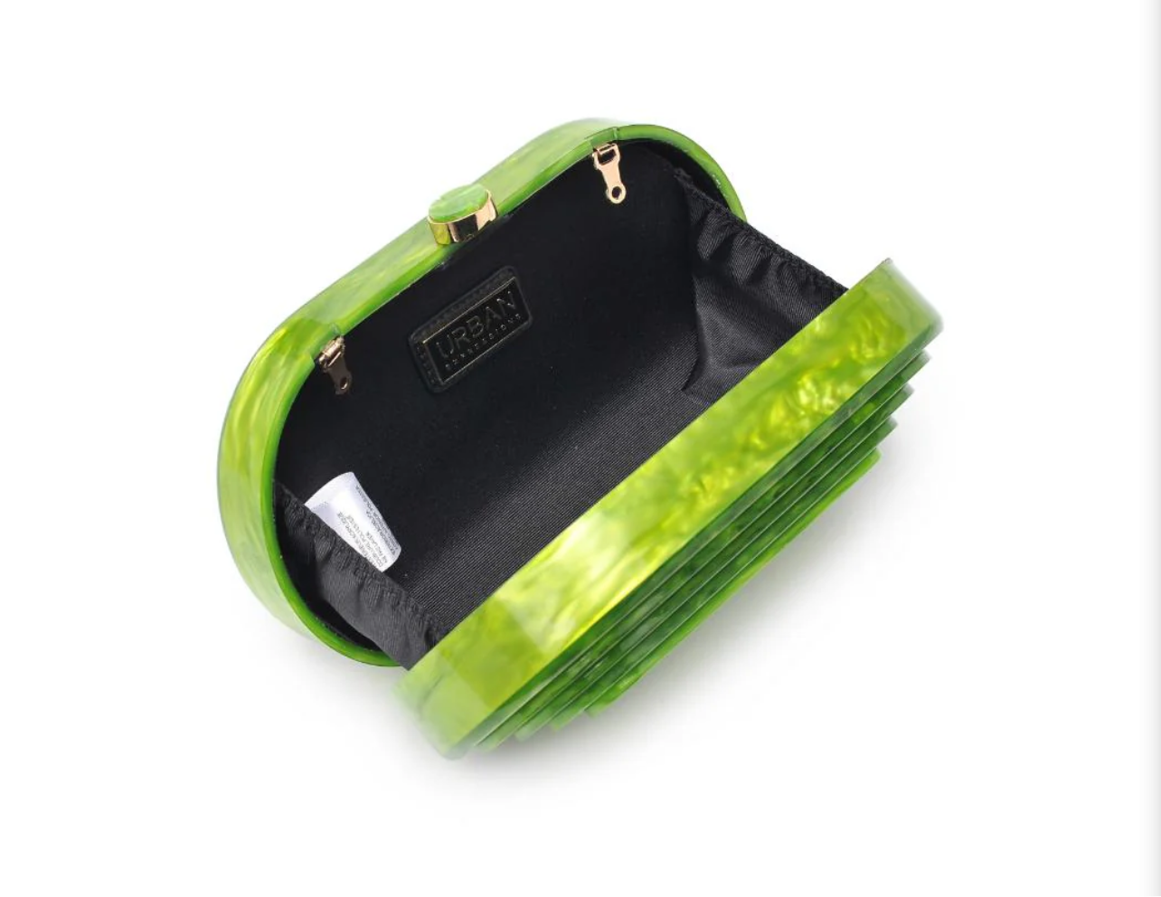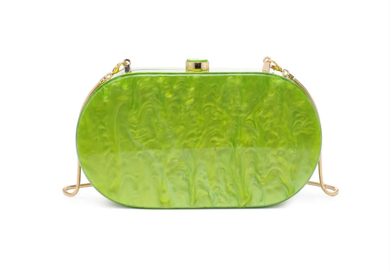 The bag that blends art deco allure with modern elegance. Crafted from marbled acetate, its captivating exterior is complemented by gold hardware, creating a timeless aesthetic. Carry it as a clutch or use the detachable chain strap, and find your essentials organized within the fabric-lined interior.