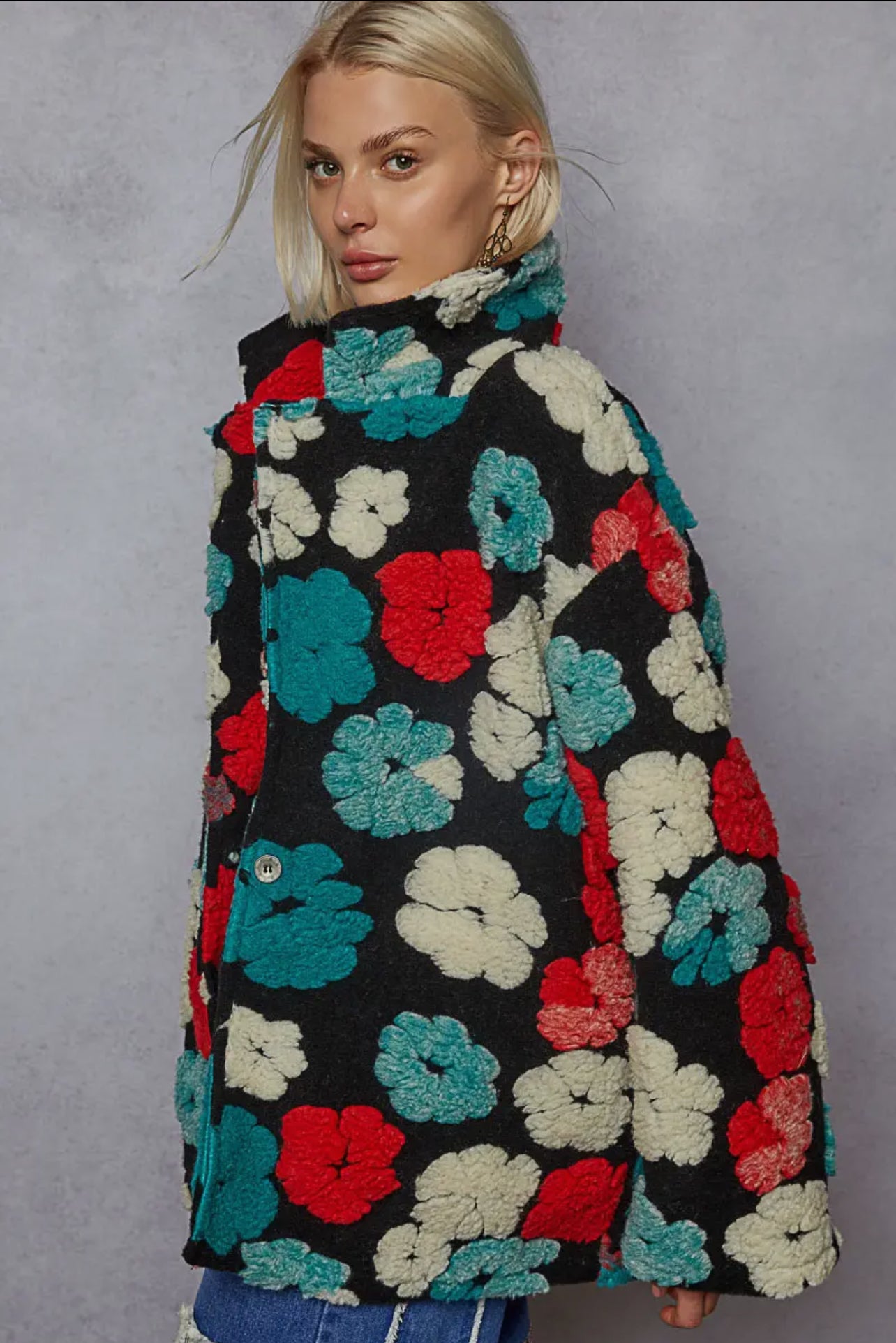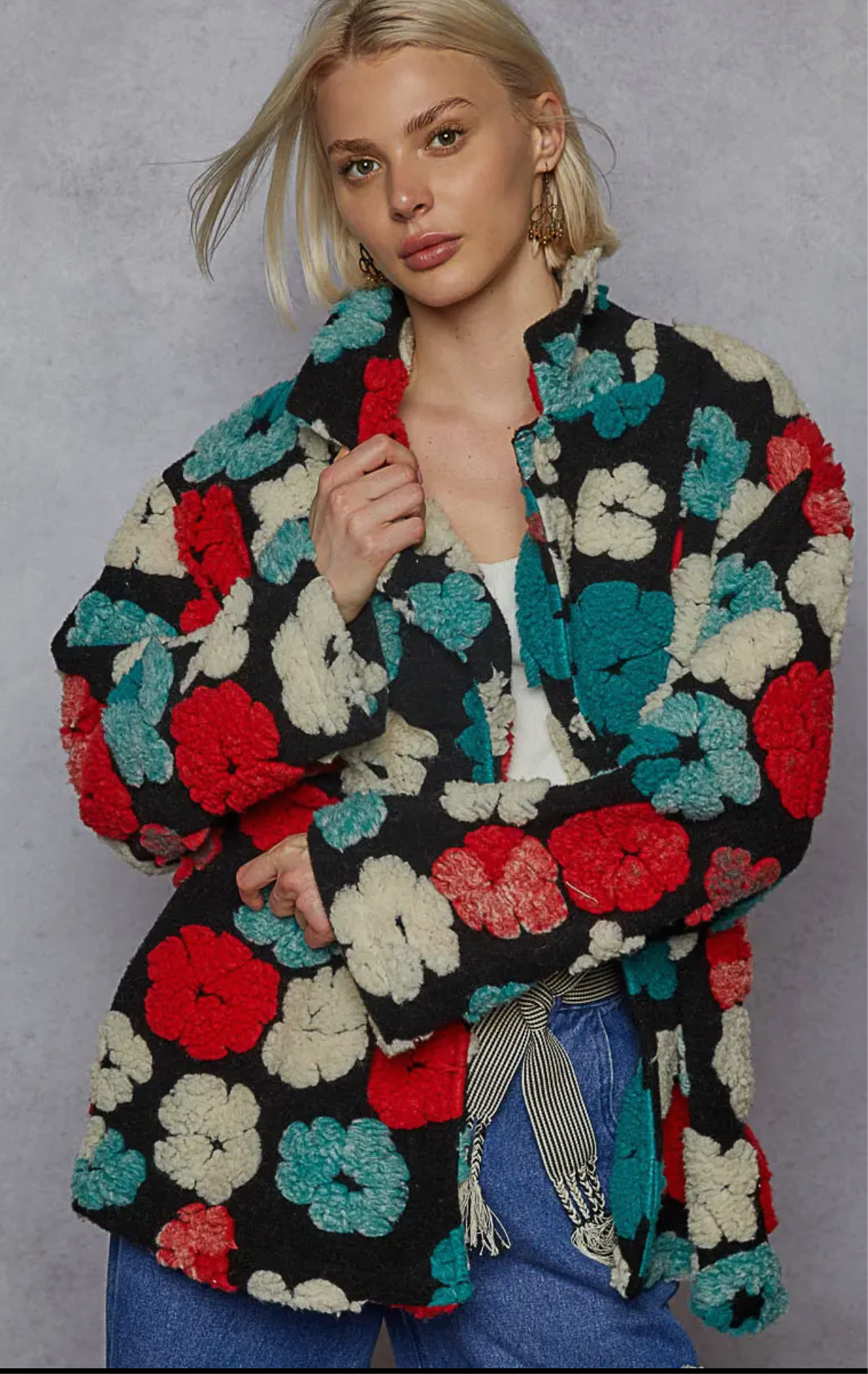 The MIA Floral Tufted Jacket boasts a wool-like fabric and intricate tufted floral motifs. Contrasting piped accents add a touch of elegance, while metal snap buttons offer practicality. This jacket also features patch pockets and is fully lined. Perfect for transition into spring, replace that winter coat with this one! Boxy fit, if you want a more fitted feel, please consider sizing down one size.