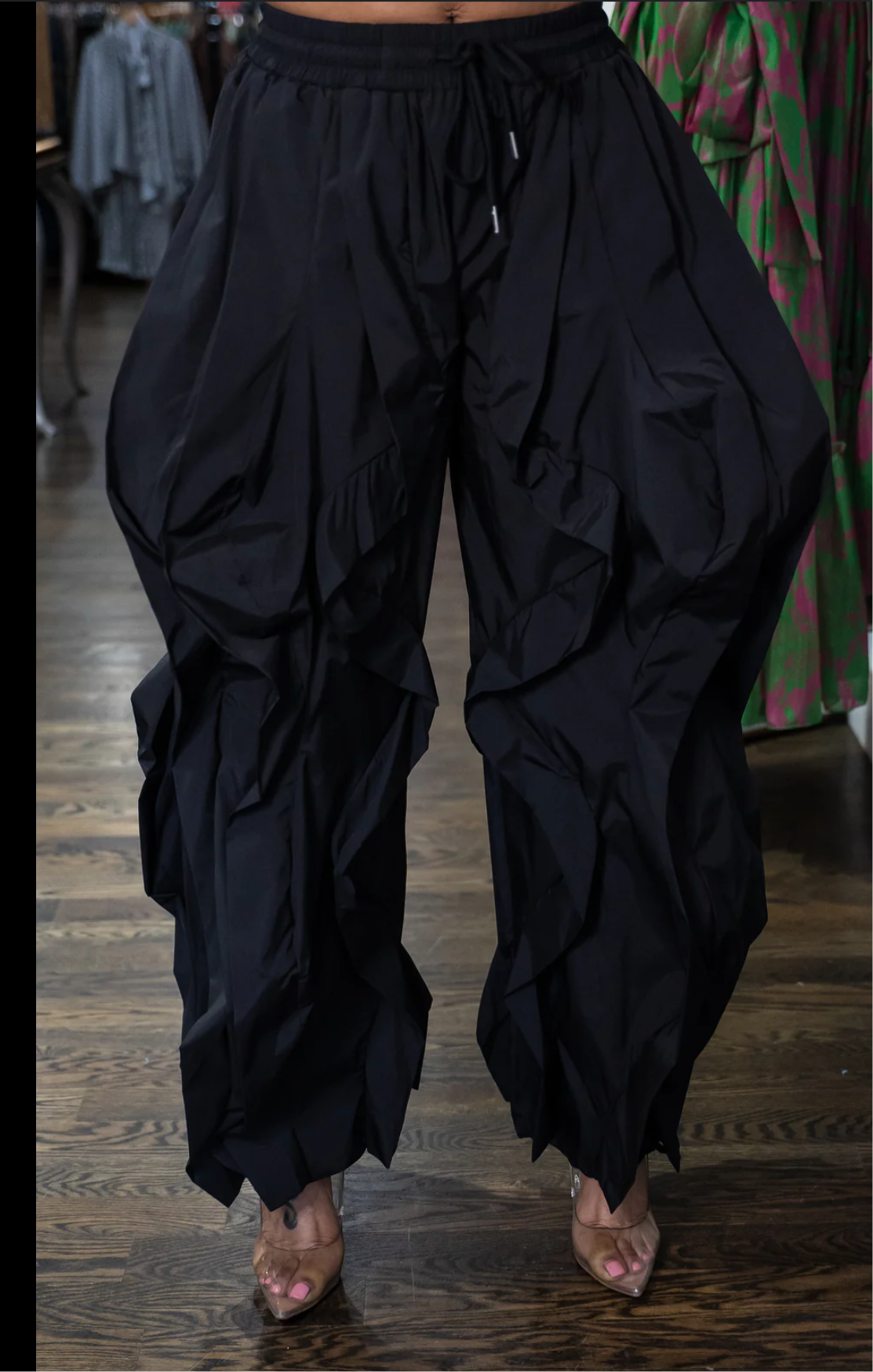 These pants redefine bold style with their voluminous silhouette and sculptural folds, creating a striking 3D effect. Featuring a comfortable elastic waistband and adjustable drawstring hem, they combine functionality with artistic design. Crafted for those who dare to stand out, these pants are perfect for making a statement in any setting.