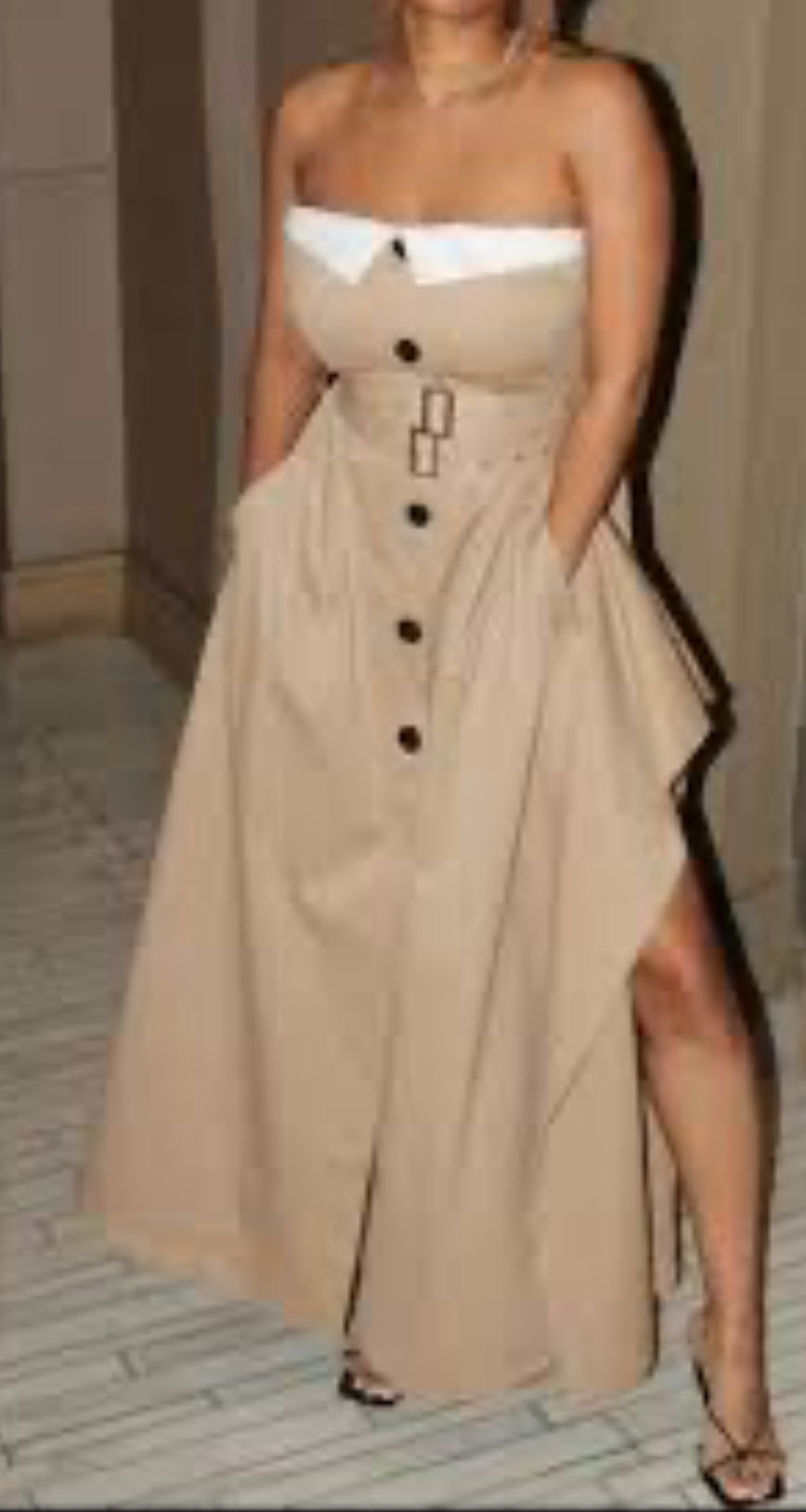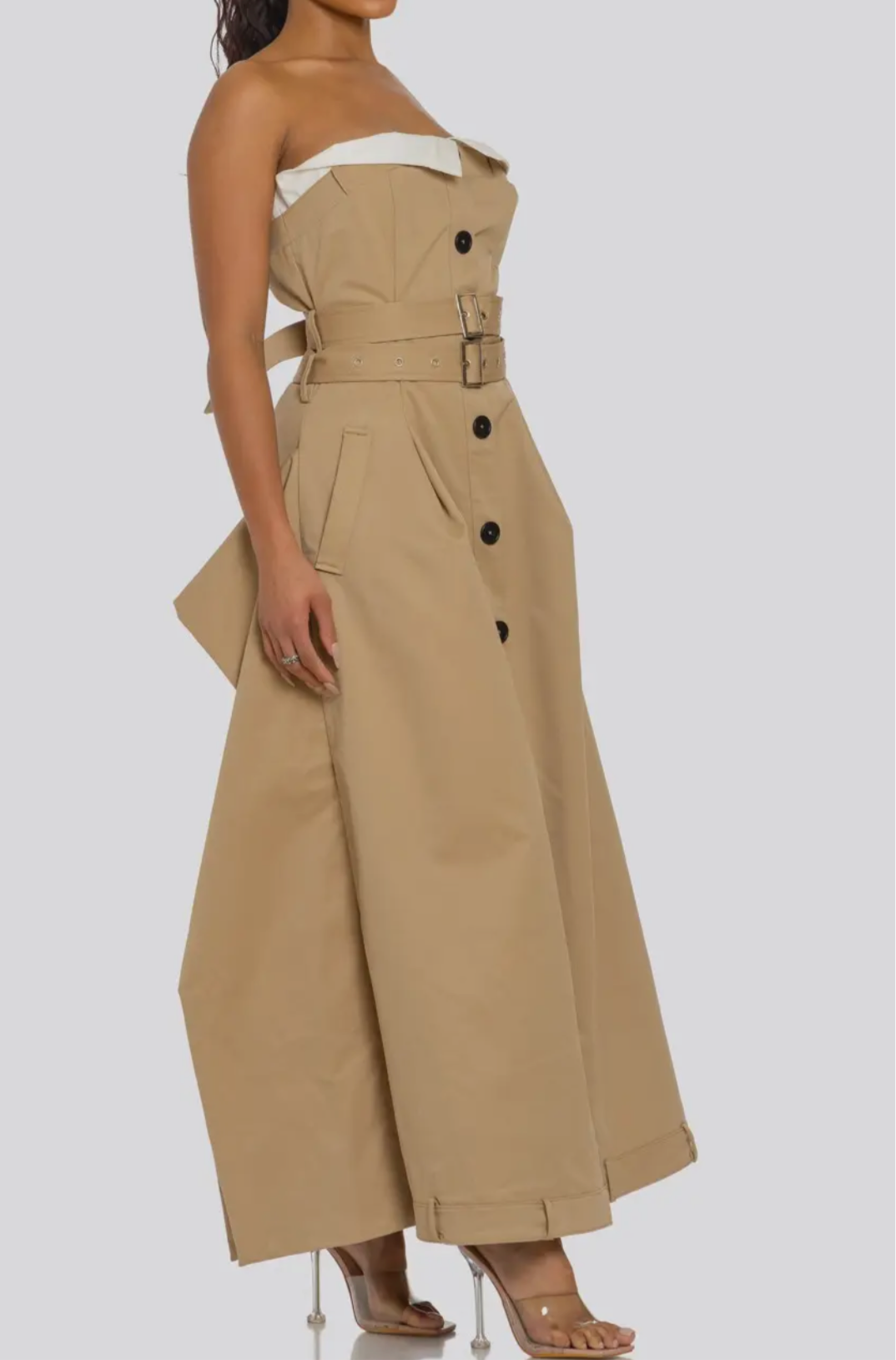 Turn heads in this chic and sophisticated midi dress. Designed with a strapless ivory bandeau neckline, this statement piece features a double-breasted bodice, structured silhouette, and belted waist that flatters the figure. The soft khaki fabric drapes into a full A-line skirt with asymmetrical flap detailing, adding a modern twist to classic tailoring. Perfect for stylish city days or elevated brunches, this dress blends timeless elegance with bold fashion-forward flair.