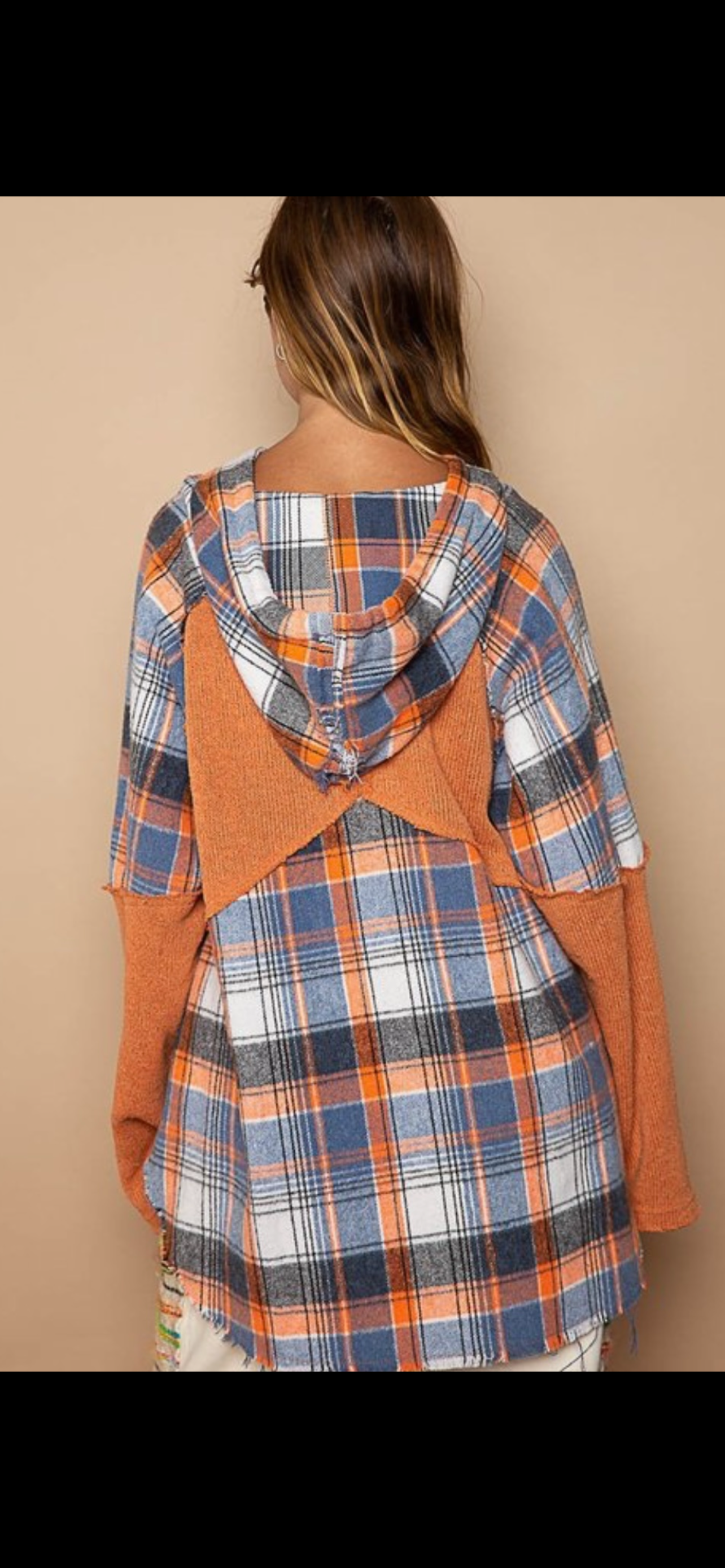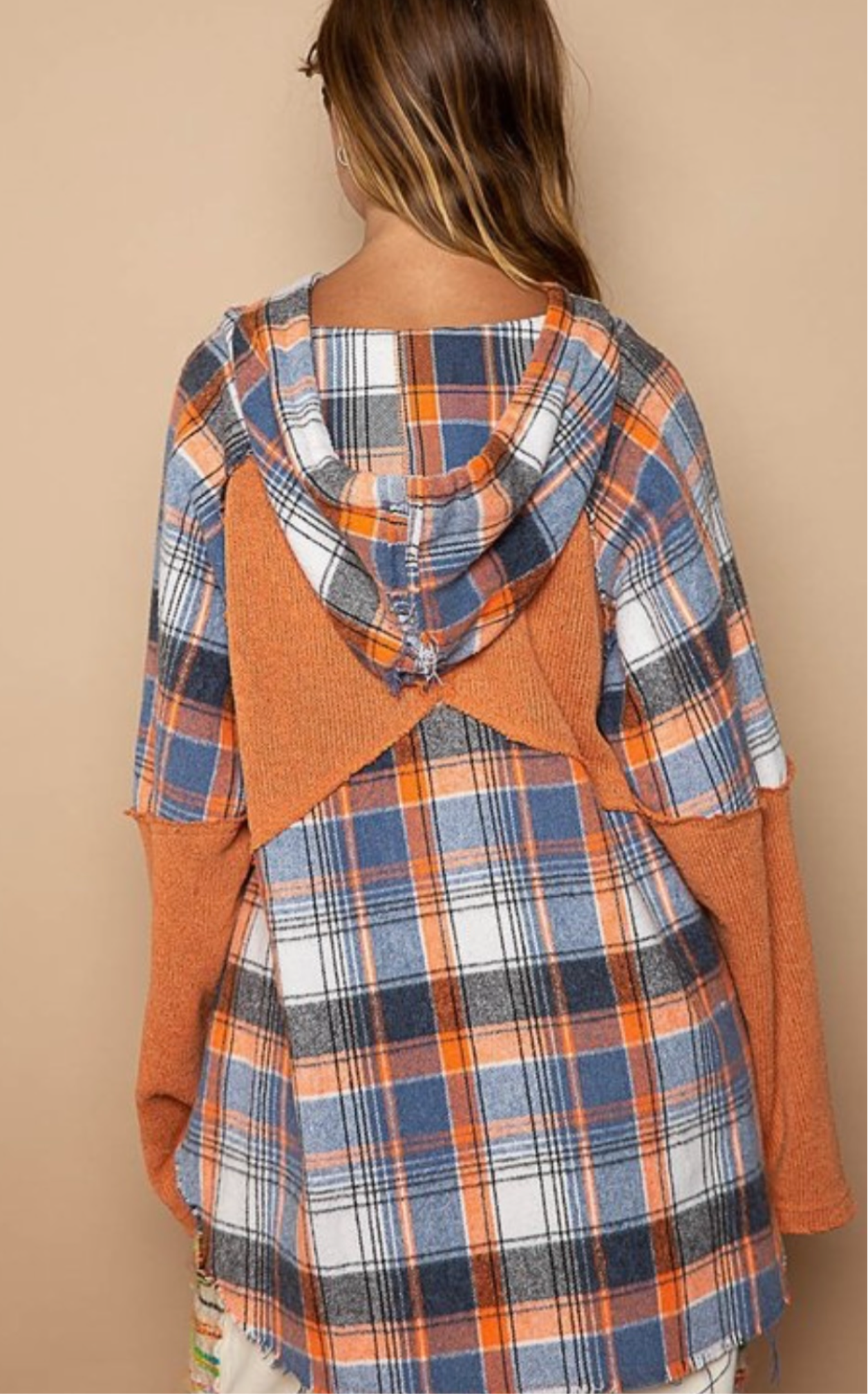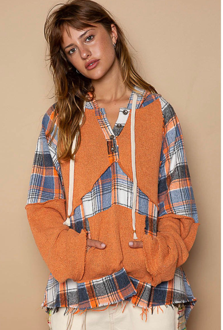 Designed in contrast long sleeves, button placket, hooded drawstring, kangaroo pocket, oversize fit, raw edge detail, vintage washed, plaid top.